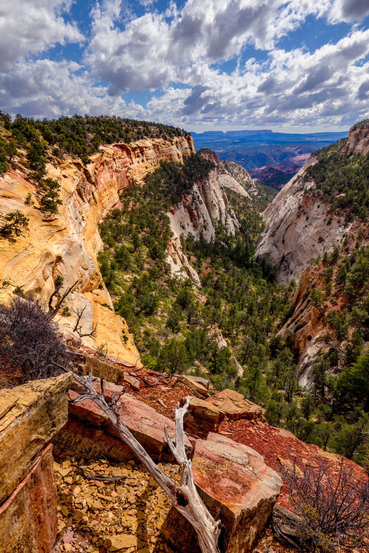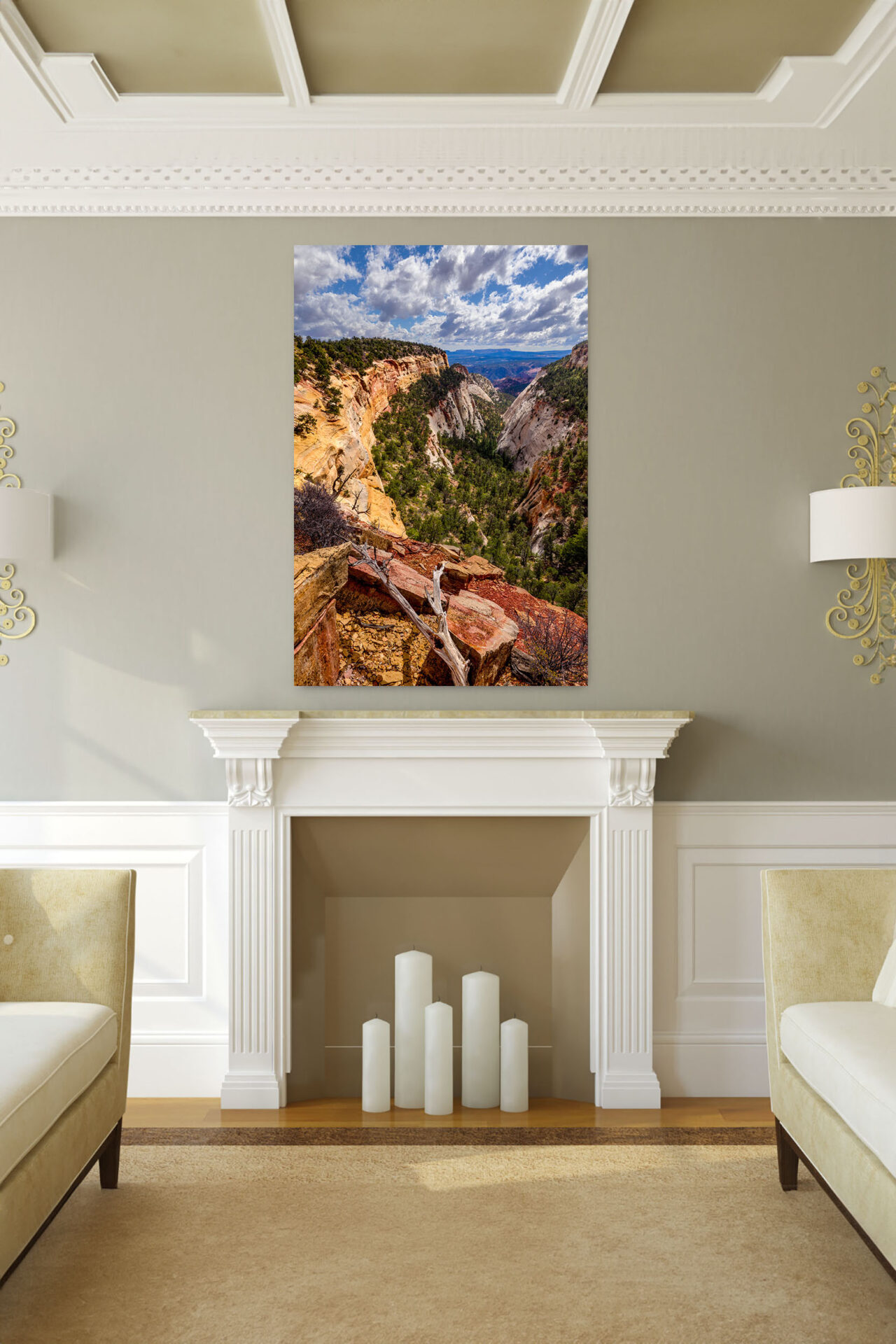 Fine art photographic print. What lies beyond Checkerboard Mesa in Zion National Park? To truly know, you must climb to the top and look down the other side. Two ridges of rock stretch out into the distance with a canyon in between. The gently curved ridge on the left side is composed of the most interesting yellow rocks. It is a land with trees filling the canyon and growing on the ledges. Continuing beyond, it is a wild and untamed land, the wilderness of Zion.