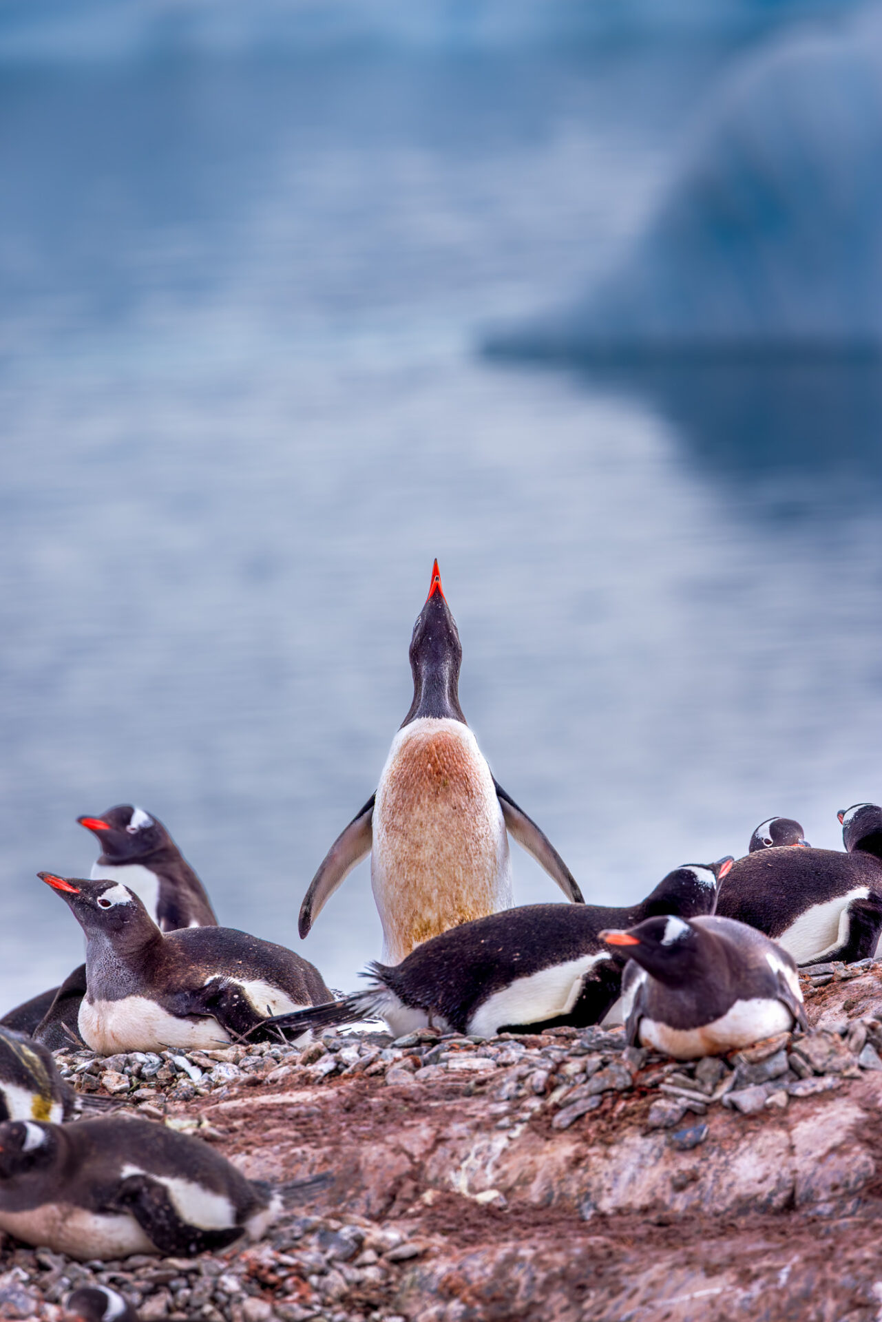 - Gentoo penguin squawking – A striking pose of a penguin with its head pointed high, breaking into song. The wonderful blue background of antarctic waters with icebergs lets the subject stand out.