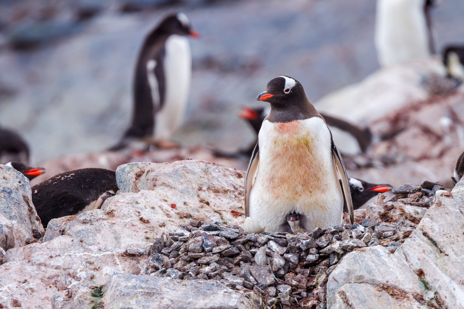 Fine art photographic print. In the Antarctic Peninsula, a Gentoo penguin keeps her one-week old chick warm, cuddled against her belly. Hundreds of penguins with chicks are here in this colony on Cuverville Island.
